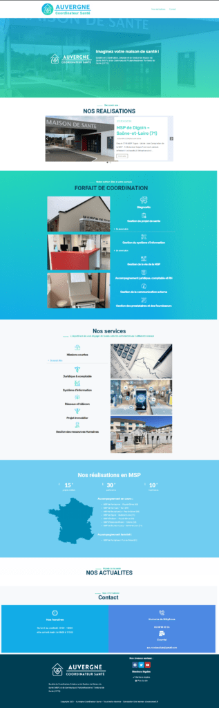 Clover Conseil est très honorée d’avoir réalisé la conception d’un site internet vitrine pour l’entreprise Auvergne Coordinateur Santé entreprise dans le domaine de la santé, c’est une société de Coordination, de Création et de Gestion de Maison de Santé (MSP), et de Communauté Pluriprofessionnel Territorial de Santé (CPTS).  C’est avec joie que nous avons accepté de réaliser ce projet et d’accompagner Nicolas dans son projet de modernisation de et de digitialisation.  Les principales fonctionnalités :